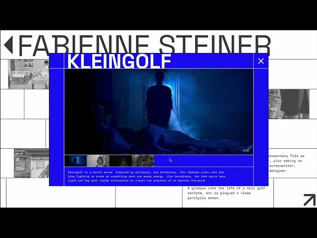 The videos are trimmed to a minute, the chosen film stills dissect only select parts of a film and the awards are a fraction of the creator's achievements. The bottom right arrow leads to the creator's portfolio which collaborators can use to connect directly.